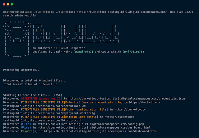 Accidental sensitive file leakages are a big problem that affects the security posture of individuals and organisations. BucketLoot comes with a 80+ unique regEx signatures list in vulnFiles.json which allows users to flag these sensitive files based on file names or extensions.