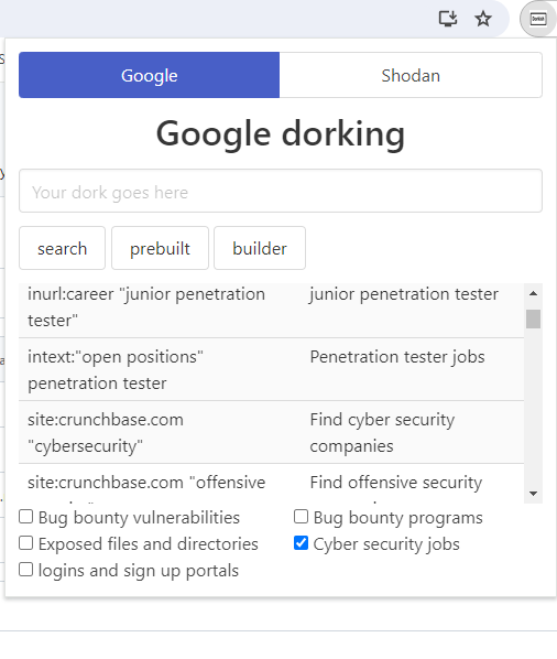- Prebuilt dorks for cyber secruity jobs