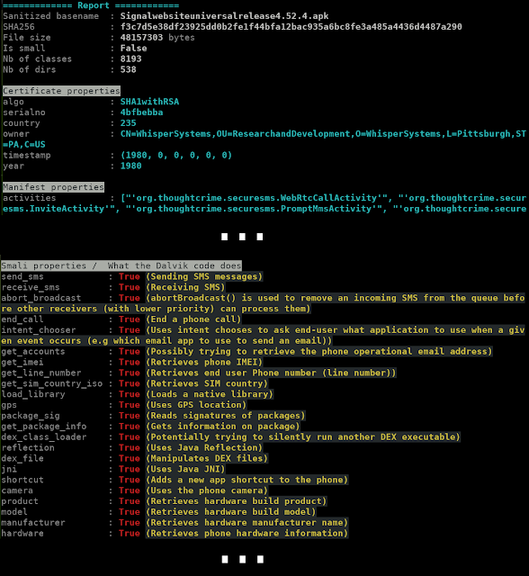 droidlysis --input Signal-website-universal-release-6.26.3.apk --output /tmp --config /PATH/TO/DROIDLYSIS/conf/general.conf