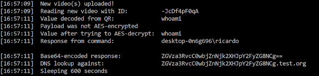 After finding there is a new video in the channel, it decodes the QR code from the video thumbnail, executes the command and the response is base64-encoded and exfiltrated using DNS: