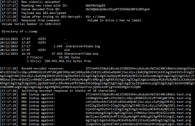 This works also for QR codes with AES-encrypted payloads and longer command responses. In this example, the file “dirtemp_aes.avi” from example-videos is uploaded and the content of c:\temp is exfiltrated using several DNS queries: