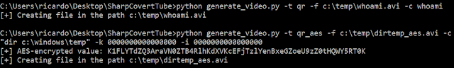 python generate_video.py -t qr_aes -f c:\temp\dirtemp_aes.avi -c "dir c:\windows\temp" -k 0000000000000000 -i 0000000000000000