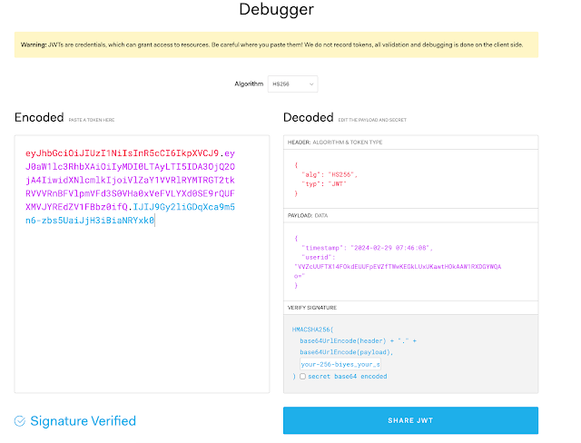 - Decoded JWT: {'timestamp': '2024-02-29 08:16:51', 'userid': 'VVZcUUFTX14FZxMRVUdnEgJZEmxfRztRVUBabAsRZkdVVlJWWztGQVA='}