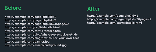 It doesn’t make any http requests to the URLs and removes: – incremental urls e.g. /page/1/ and /page/2/ – blog posts and similar human written content e.g. /posts/a-brief-history-of-time – urls with same path but parameter value difference e.g. /page.php?id=1 and /page.php?id=2 – images, js, css and other “useless” files